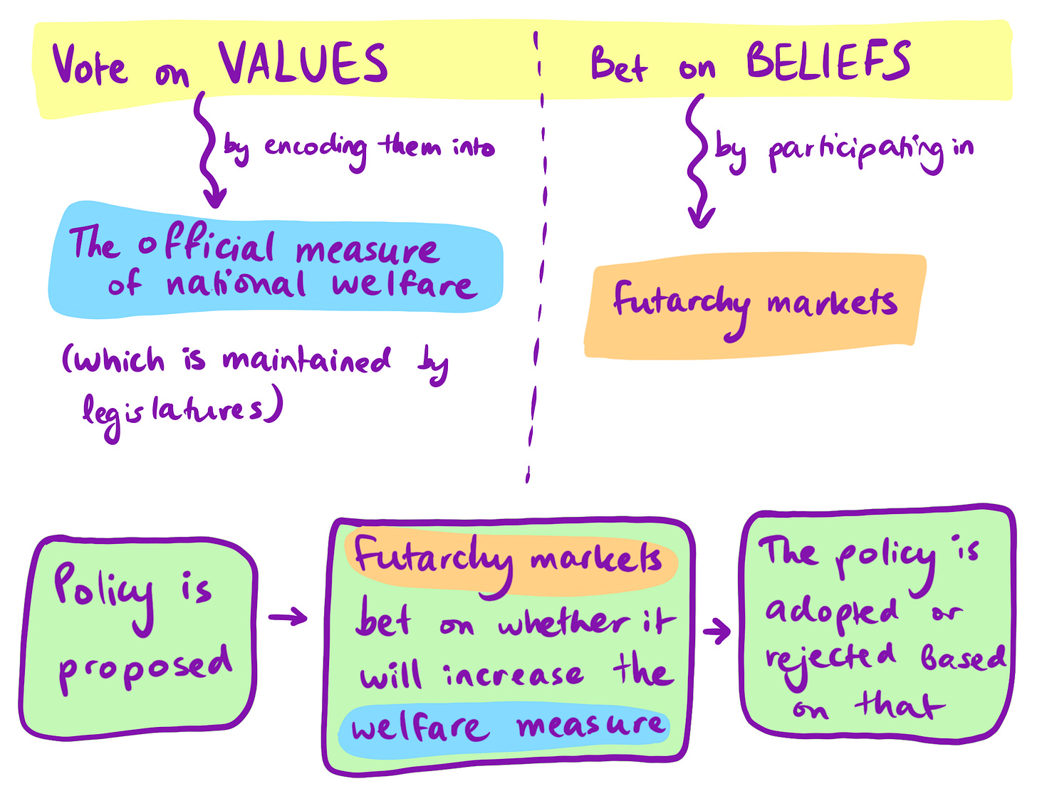 Hanson’s idea came from his observation that democracies often struggle to make effective decisions because they don’t fully use the information available. In traditional democracy, people vote for leaders or policies based on promises, but those promises don’t always lead to the best outcomes. Futarchy aims to fix this by separating the “what” (the goal) from the “how” (the policy), letting markets figure out the best path forward (Hanson, 2014).